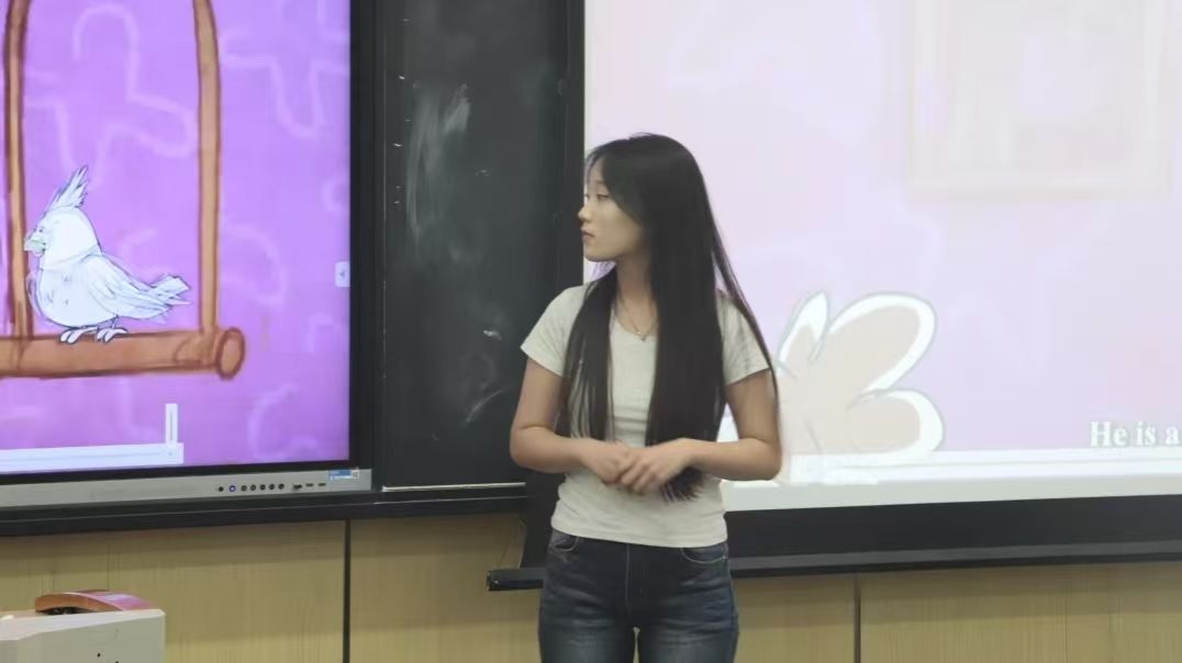 紧接着,来自教育学院小学教育专业英语方向2021级210810201班的高洁同学接力登场。她巧妙借助趣味动画、互动课件等多媒体工具,构建沉浸式学习场景,将抽象知识转化为直观体验,充分展现扎实的教学功底与创新思维,赢得全场一致好评。经验分享环节中,高洁从备课构思、课堂实施、课后反思三个维度展开,细致解析如何立足学情创设教学情境,并灵活调整教学策略,精准捕捉学生兴趣点,让课堂“活”起来。