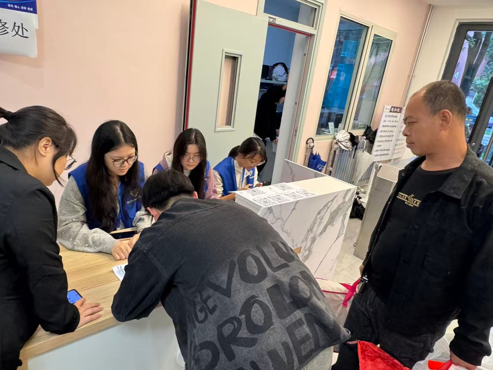 在报到点,志愿者们耐心地为新生讲解流程,发放公寓用品以及军训用品,为来自天南海北的新生们驱散初来乍到的陌生与无措。志愿者们各司其职,不遗余力的为学弟学妹们提供最周全的服务,一切都在高效有序、有条不紊地进行着......