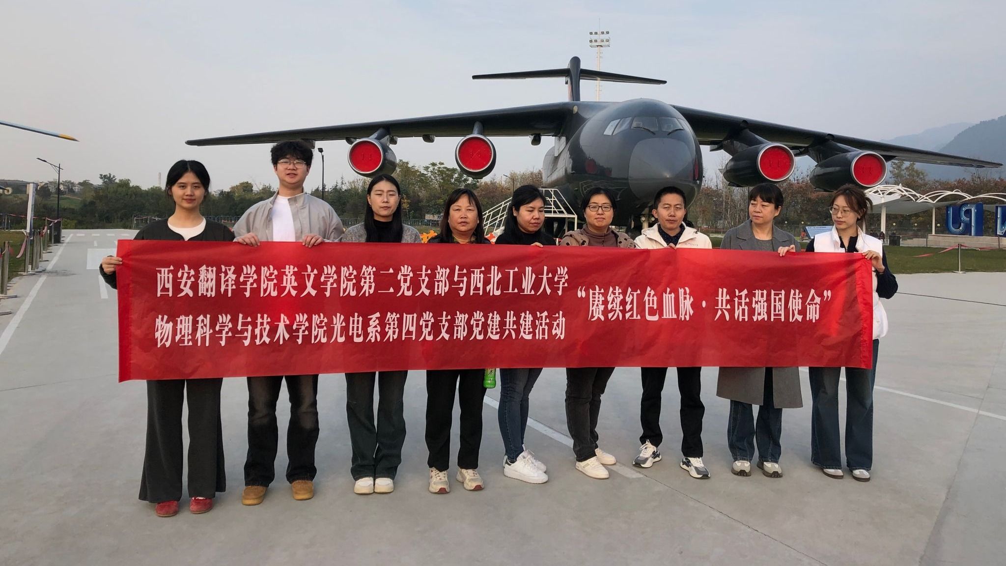 随后,我支部党员走进飞机展览馆参观学习。展区全面呈现了中国航空工业的发展脉络,也彰显了西工大在“三航”领域长期承担国家重大任务、为国防事业输送人才的光荣传统。室外飞机展以实体展示为主,涵盖歼-8E、歼-7、轰-6、运-20等多型经典航空装备。党员们在近距离观摩机型实物、深入了解相关技术背景的过程中,切身感受到我国航空事业从艰难起步到逐步领先的非凡历程。大家深受震撼,对“航空报国、科技强国”的精神内涵也有了更加深刻的理解与体悟。
